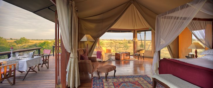 The award-winning camp is surrounded by riverine woodland on the banks of the famous Ntiakitiak River where hippos and other wildlife crowd to quench their daily thirst. Eleven of the camp’s twelve luxury tents measure 800 square feet with the honeymoon suite measuring 1,100 square feet and has its own plunge pool overlooking the Mara plains.