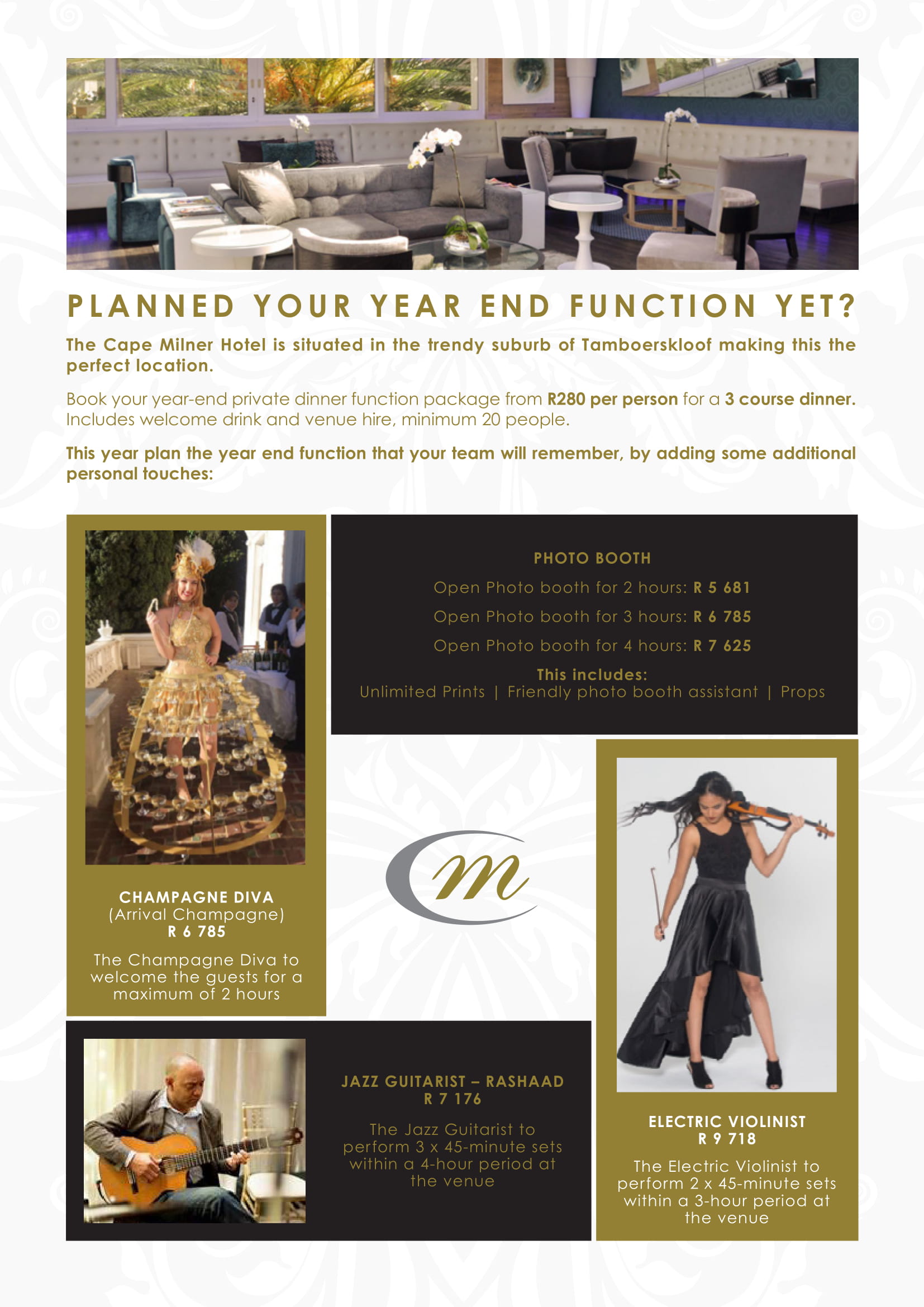 To book, or receive more information on a year end function at The Cape Milner Hotel, contact The Cape Milner Hotel on Tel: 021 426 1101, or Email [email protected]