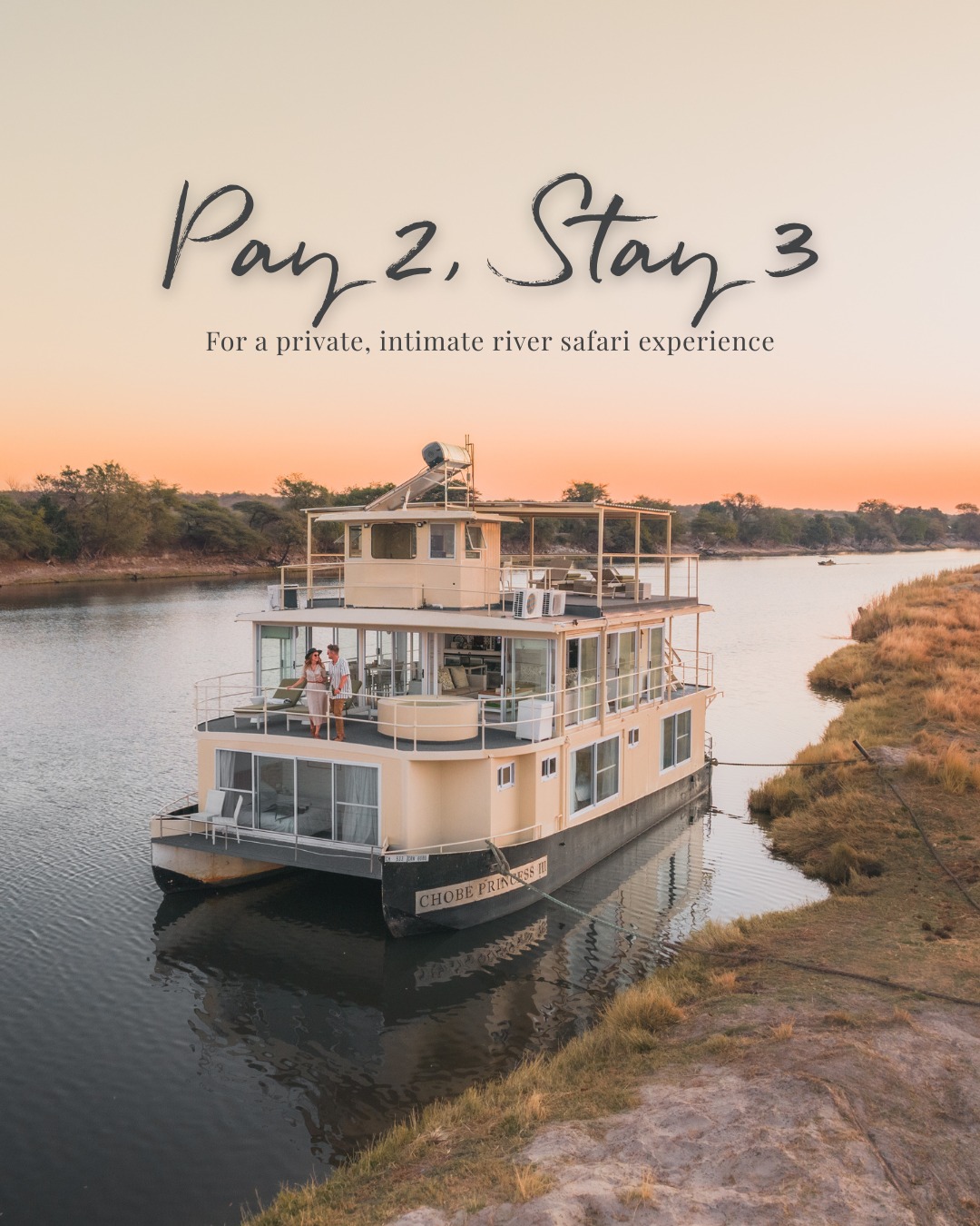 Chobe Princess: Pay 2, Stay 3 for a private, intimate river safari experience.